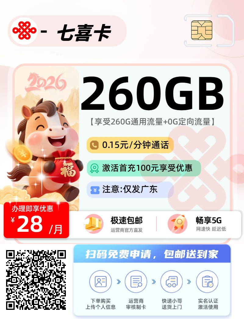 - 流量/通话:260G(28元260G通用+0.15元/分钟)。
