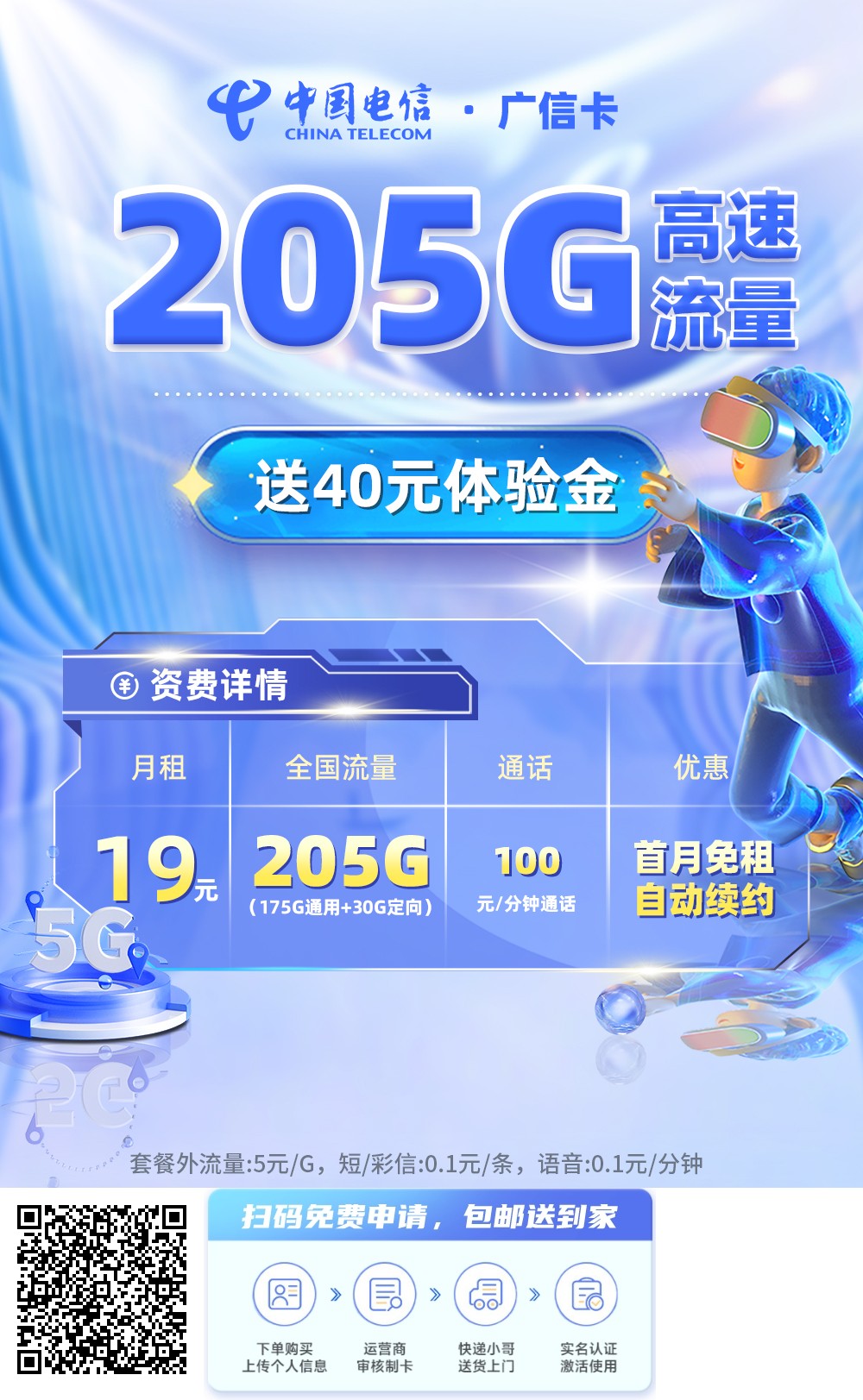 - 流量/通话:205G(19元/月享175G全国通用流量+30G定向流量+100分钟)。