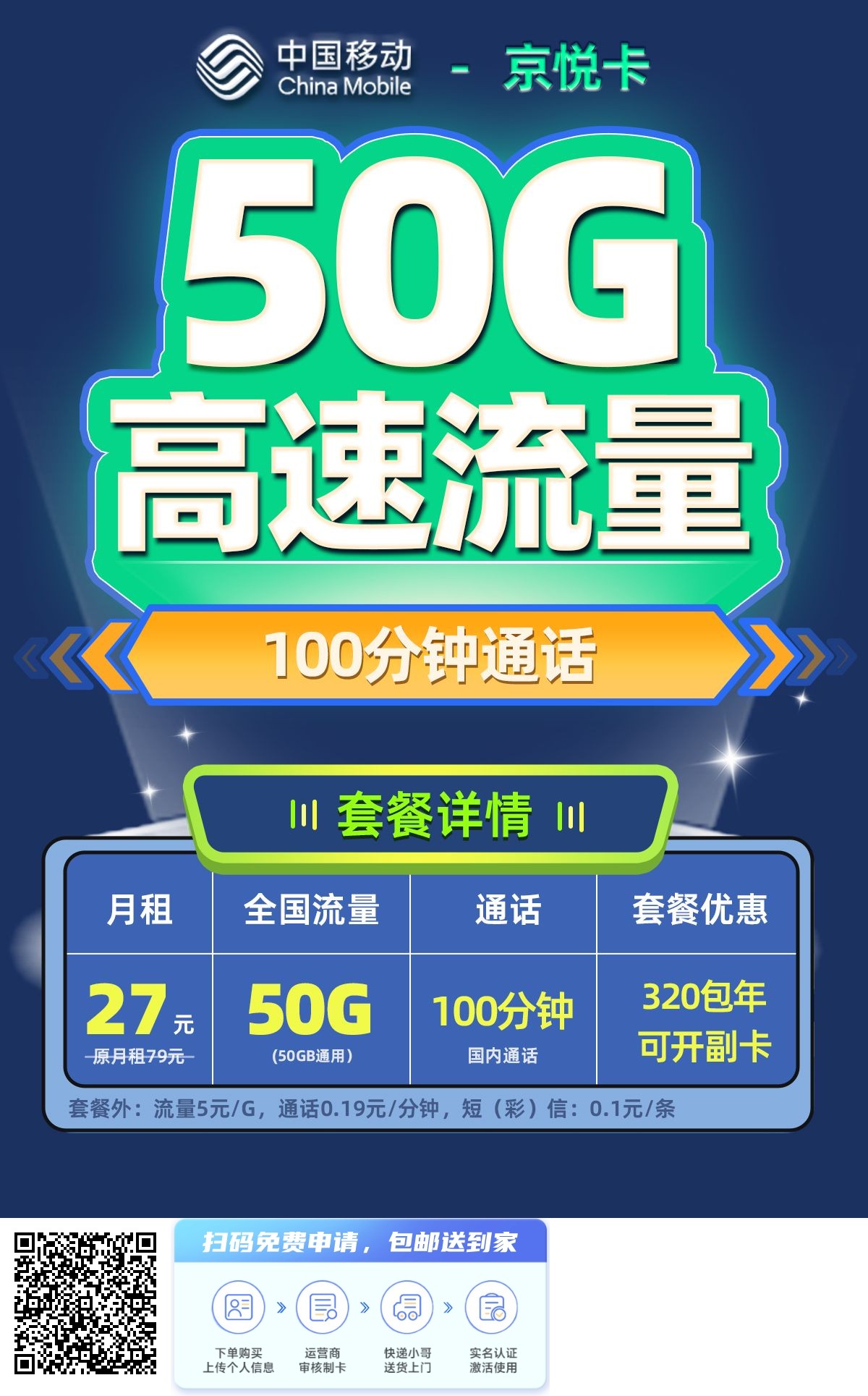 - 流量/通话:50G(27元/月享50G全国通用+100分钟通话)。