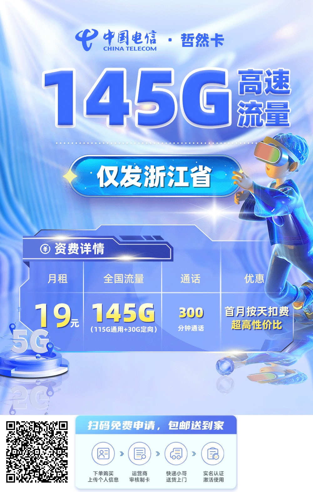 - 流量/通话:145G(19元/月享115G全国通用流量+30G定向流量+300分钟通话)。