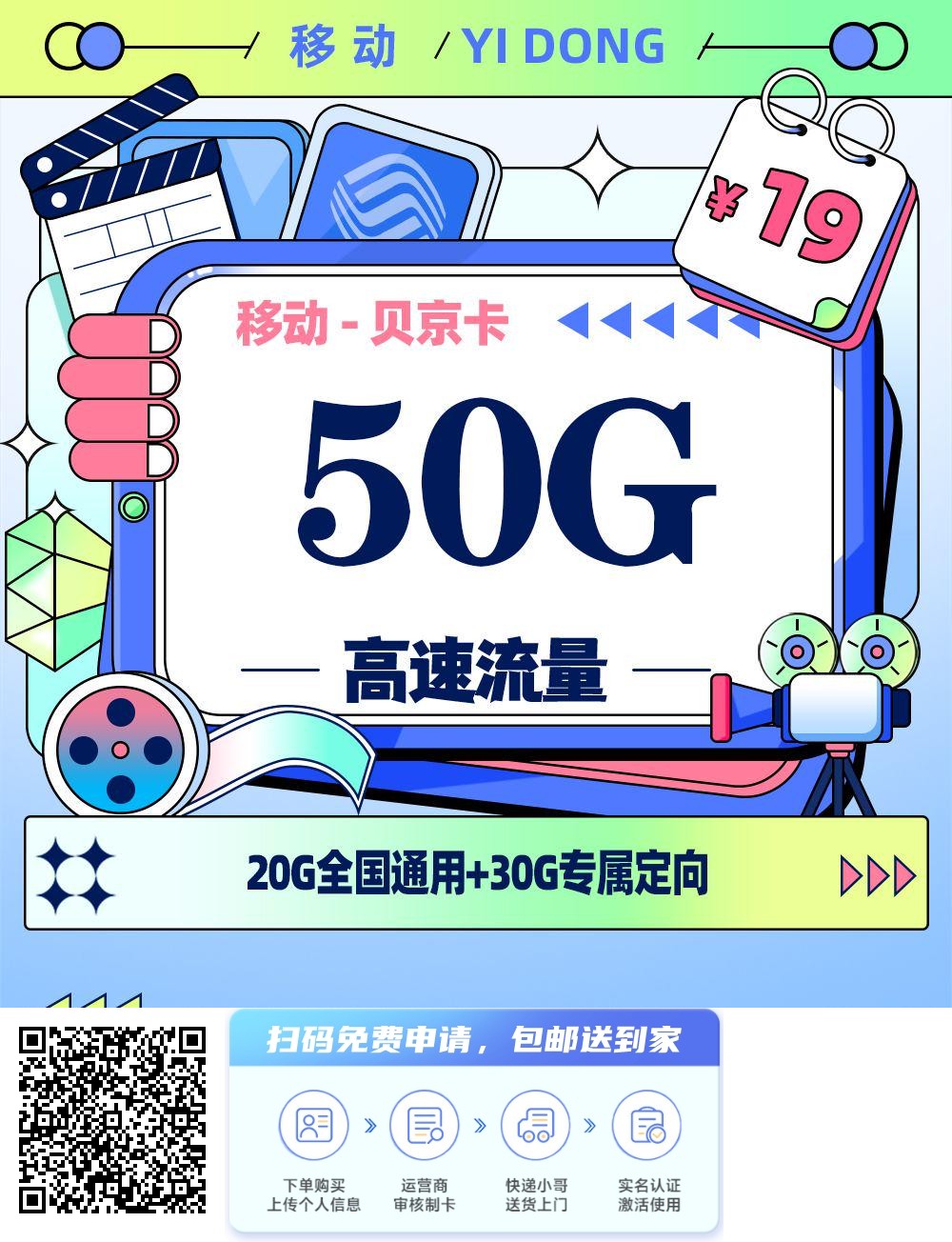 - 流量/通话:50G(19元/月享20G全国通用+30G定向流量+0.1元/分钟语音通话)。